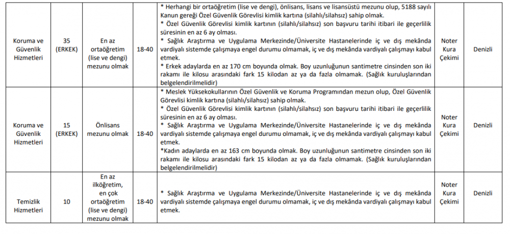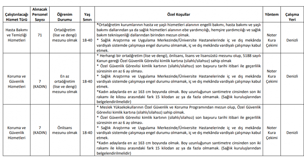 Denizli Pamukkale Üniversitesi Rektörlüğü tarafından 'Sürekli İşçi Alımı' başlığı altında yayımlanan personel alımı duyurusunda, "Pamukkale Üniversitesi Sağlık Araştırma ve Uygulama Merkezi Müdürlüğünde/Üniversite Hastanelerinde çalıştırılmak üzere 657 sayılı Devlet Memurları Kanunun 4/D maddesi, 4857 sayılı İş Kanunu, Kamu Kurum ve Kuruluşlarına İşçi Alınmasında Uygulanacak Usul ve Esaslar Hakkında Yönetmelik hükümleri kapsamında Türkiye İş Kurumu (İŞKUR) üzerinden aşağıda yer alan tabloda dağılımı gösterilen şekilde 'Sürekli İşçi' alınacaktır." ifadeleri görülürken başvuru yapacak adaylarda aranacak genel ve özel şartlar şu şekilde oldu: