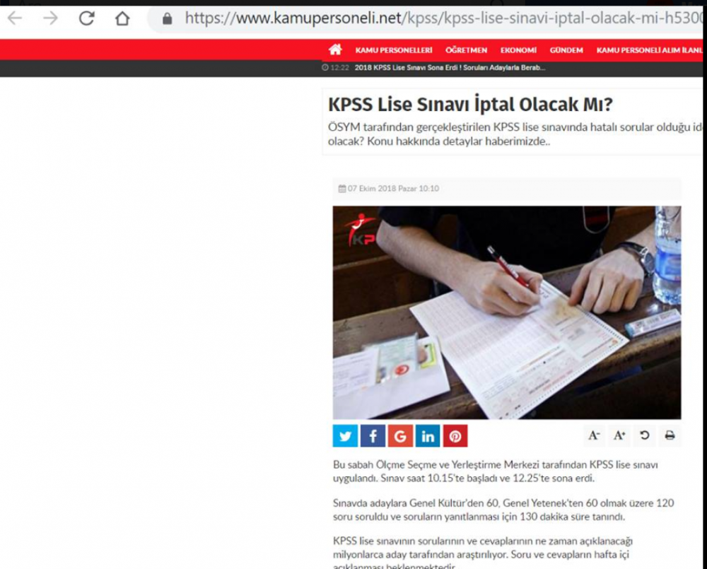 Kamu Personeli isimli internet sitesinde bugün adayların gözünden kaçmayan bir haber yer aldı. 7 Ekim 2018 KPSS'nin iptal edileceğine yönelik haberin saat 10.10'da yer aldığını gören adaylar ÖSYM ve çeşitli kurumlara sınavla ilgili telefon açmaya başladılar.