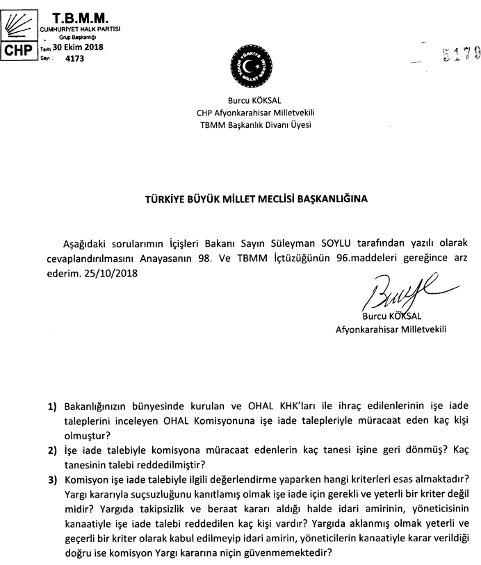 Söz konusu soru önergesinde, İçişleri Bakanlığı bünyesinde bulunurken, OHAL kapsamında yayımlanan Kanun Hükmünde Kararname ile görevinden ihraç edilen personellerden, işe iade talebi için OHAL Komisyonuna başvuru yapanların sayısının kaç kişi olduğu sorusu soruldu.