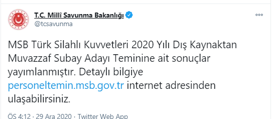 Türk Silahlı Kuvvetleri 2020 yılı Dış Kaynaktan subay alımı sonuçları açıklandı.