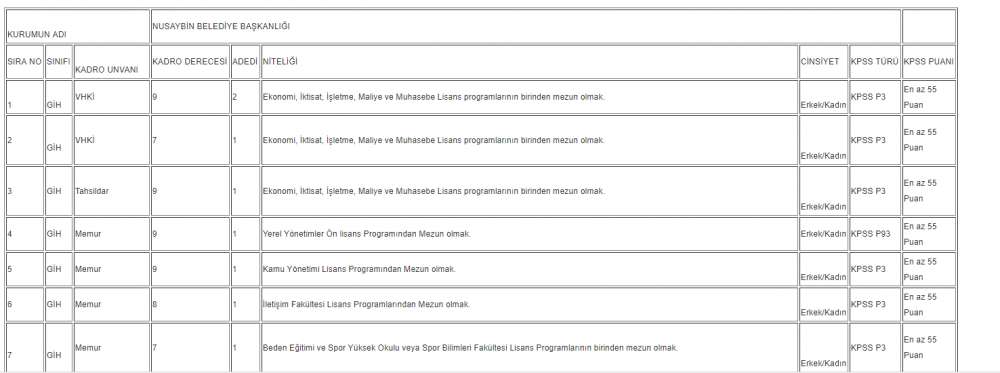 Nusaybin Beleidye Başkanlığı'na memur alımı yapılacağına dair duyuru Sözcü Gazetesi ve çeşitli basın yayın kuruluşları aracılığıyla kamuoyu ile paylaşıldı. Nusaybin Belediye Başkanlığı'ndan duyuru başlığıyla yayımlanan ilanda, "Mardin ili, Nusaybin Belediye Başkanlığı bünyesinde 657 sayılı Devlet Memurları Kanununa tabi olarak istihdam edilmek üzere; Mahalli İdarelere İlk Defa Atanacaklara Dair Sınav ve Atama Yönetmenliği hükümlerine göre aşağıda unvanı, sınıfı, derecesi, adedi, nitelikleri, KPSS taban puanı ve diğer şartları taşımak kaydıyla, belirtilen boş kadro açıktan atama yoluyla memur alınacaktır." ifadeleri yer alırken, kontenjan dağılımı aşağıdaki gibi oldu:
