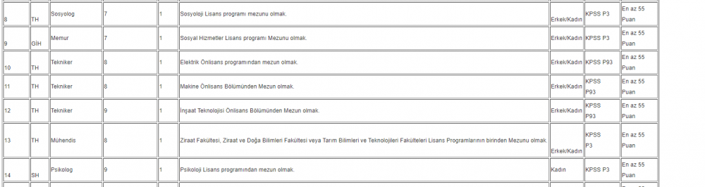 | 11 | TH | Tekniker | 8 | 1 | Makine Önlisans Bölümünden Mezun olmak. | Erkek/Kadın | KPSS P93 |
