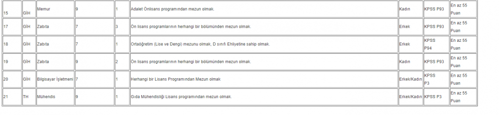| 17 | GİH | Zabıta | 7 | 3 | Ön lisans programlarının herhangi bir bölümünden mezun olmak. | Erkek | KPSS P93 | En az 55 Puan |