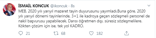 Önceki gün MEB , 2020 yatıyıl mazeret tayni duyurusu yayımladı. Yayımlanan duyuruda mazeret tayinlerinin tarihlerine yer verildi. Tayinlerle ilgili açıklama yapan İYİ Parti Adana Milletvekili İsmail Koncuk , yarıyıl mazeret tayinine 3+1 ile kadroya geçen sözleşmeli personelin de nakil başvurusu yapabileceğini söyledi.
