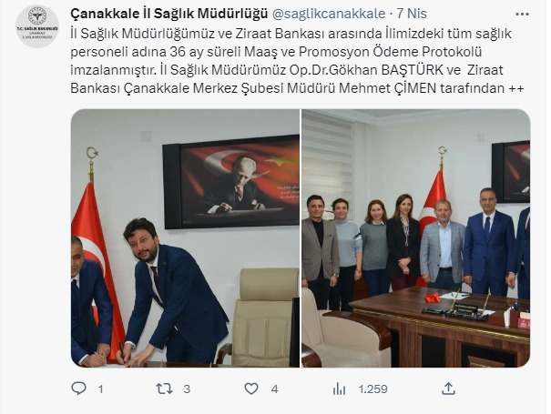 Çanakkale İl Sağlık Müdürlüğü tarafından promosyon anlaşması imzalandığına dair yapılan paylaşım ise şu şekilde: