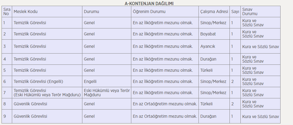 Sinop Üniversitesi Rektörlüğü tarafından yapılan duyuruda üniversiteye temizlik görevlisi , güvenlik görevlisi alımının yanı sıra İŞKUR üzerinden engelli ve eski hükümlü temizlik görevlisi de alınacağı bildirilmiş, başvuruların İŞKUR resmi sayfasından 7 Mart 2020 tarihine kadar devam edeceği belirtilmişti. 2 Mart 2020 tarihinde yayımlanan duyuruda, "Rektörlüğümüz Birimlerinde İstihdam Edilmek Üzere Türkiye İş Kurumu (İŞKUR) Aracılığıyla Sürekli İşçi Alınacaktır. Sinop Üniversitesi Rektörlüğü ve bağlı birimlerinde çalıştırılmak üzere 4857 sayılı İş Kanunu ve “Kamu Kurum ve Kuruluşlarında İşçi Alınmasında Uygulanacak Usul ve Esaslar Hakkında Yönetmelik” kapsamında Türkiye İş Kurumu (İŞKUR) aracılığıyla aşağıda yer alan tabloda dağılımı gösterilen şekilde "Sürekli İşçi" alımı yapılacaktır. Sürekli işçi kadrolarına ilişkin ilan, İŞ-KUR internet sitesi üzerinden yayımlanacaktır. Şartları taşıyan adayların, ilanın İŞ-KUR internet sitesinde yayınlandığı tarihten itibaren 5 gün içinde başvurularını Sinop İş Kurumu İl Müdürlüğüne/Hizmet Merkezine şahsen veya www.iskur.gov.tr adresinden yapmaları gerekmektedir." ifadeleri yer alırken kontenjan dağılımı ve başvuru şartları aşağıdaki gibi olmuştu: