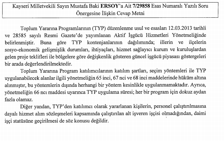 Kaysrei Milletvekili Mustafa Baki Ersoy tarafından bir soru önergesi verildi. Aile , Çalışma ve Sosyal Hizmetler Bakanı Zehra Zümrüt Selçuk'un yanıtlaması üzere verilen soru önergesinde TYP kapsamında çalışan personellere kadro verilip verilmeyeceği sorusu soruldu.