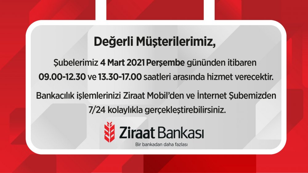 Ziraat Bankası , resmi sosyal medya hesabı üzerinden bir son dakika açıklamasında bulundu ve kontrollü normalleşmeye gidilmesi ile birlikte yarından itibaren banka şubelerinin de çalışma saatlerinin değiştiğini duyurdu. Buna göre banka artık 09.00-12.30 ve 13.30-17.00 saatlerinde hizmet verecek.