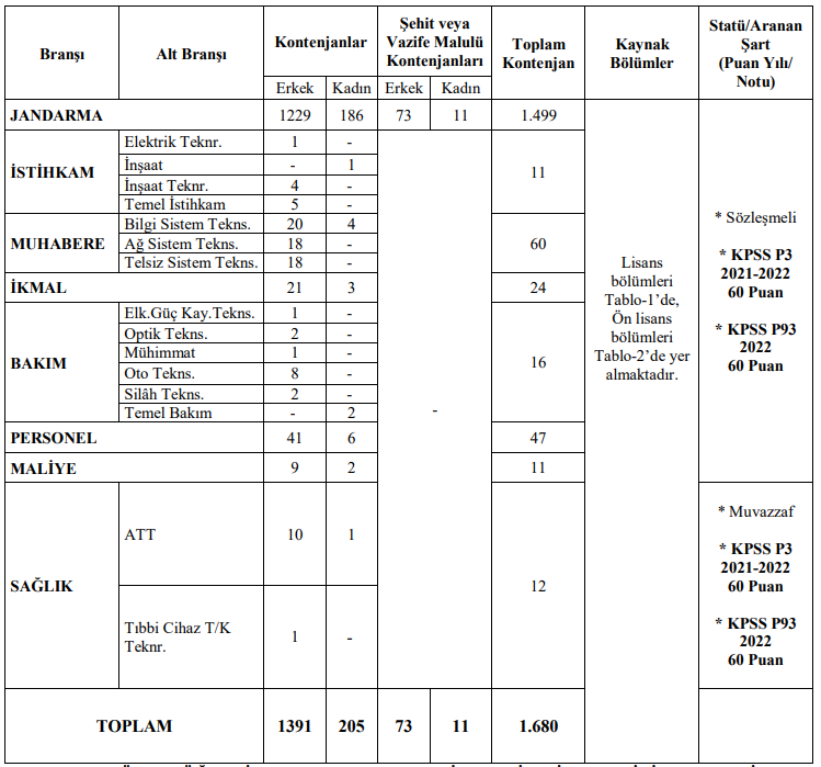 Yayımlanan başvuru kılavuzunda 1.464 erkek, 216 kadın olmak üzere 1.680 muvazzaf/sözleşmeli astsubay alımı yapılacak.