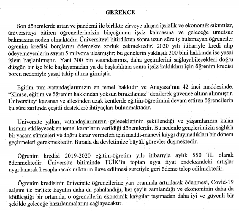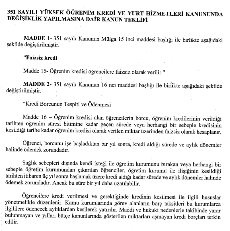 TBMM Plan ve Bütçe Komisyonu 'na gelen 351 Sayılı Yüksek Öğrenim Kredi ve Yurt Hizmetleri Kanununda Değişiklik Yapılmasına Dair Kanun Teklifi 'nin özet kısmında şu ifadelere yer verildi: