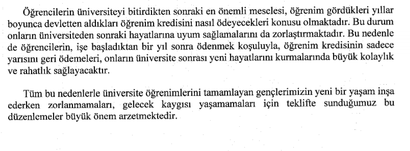 "Teklif ile, öğrenim kredisi alan öğrencilerin aldıkları kredi miktarının artırılması, öğrenim kredisinin faizsiz olarak verilmesi ve öğrenim kredisi borçlarını ödeme hususunda kolaylık sağlanması amaçlanmaktadır."