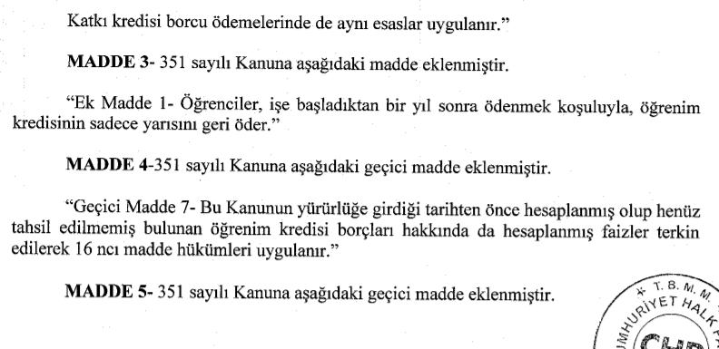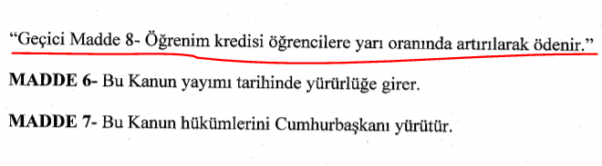 TBMM 'ye sunulan kanun teklifinde KYK kredi ve bursunun öğrencilere yarı oranında arttırılarak , yani üzde 50 zam uygulanarak ödenmesi istendi. Mevcut dönemde öğrenciler 550 TL burs ve kredi alıyor. Teklifin kabul olması durumunda kredi vve burs miktarı 775 TL olacak.