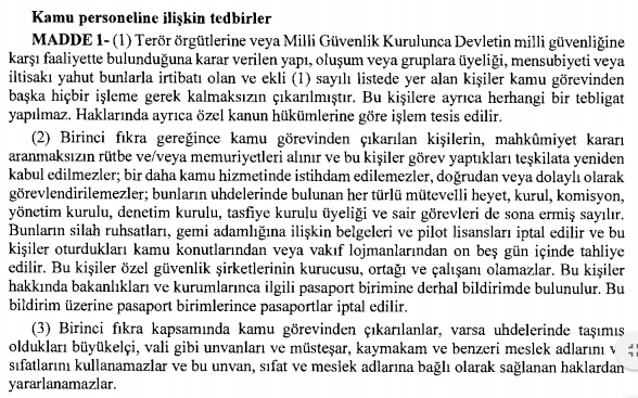 701 sayılı KHK ile kamudan 18 bindne fazla personel ihraç edilmiş binlere kişinin rütbesi alınmış ve bazı kurumlar kapatılmıştı. Söz konusu KHK geçtiğimiz günlerde TBMM'de görüşülmüştü. Tartışmalar içinde geçen görüşmelerin ardndan KHK kabul edilmiş ve bazı değişiklikler yapılarak kabul edilmişti.