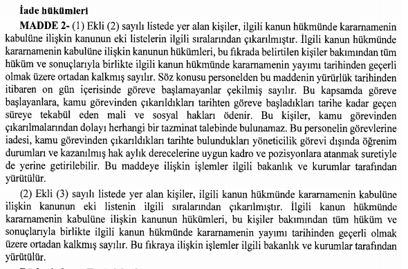 Resmi Gazete'nin bugünkü sayısında 7150 sayılı Kanun yayımlandı. Yayımlanan kanunda OHAL kapsamında bazı tedbirlerin alınması hakkında kanun hükmünde kararnamenin değiştirilerek kabul edilmesine dair kanun yayımlandı. Yayımlanan kanun ile kamudan ihraç edilen personeller kesinleşti.