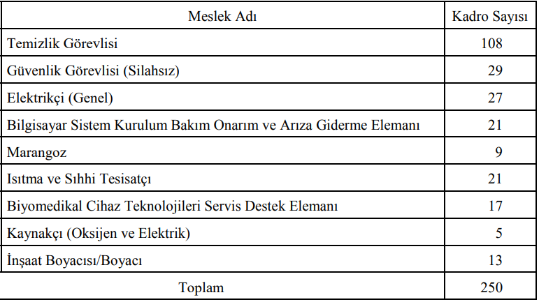 Sağlık Bakanlığı tarafındna Resmi Gazete 'de bir duyuru yayımlandı. Yayımlanan duyuruda Sağlık Bakanlığı merkez ve taşra teşkilatı hizmet birimlerinde, 4857 sayılı İş Kanunu ile mezkûr Kanuna dayanılarak çıkarılan, Kamu Kurum ve Kuruluşlarına İşçi Alınmasında Uygulanacak Usul ve Esaslar Hakkında Yönetmelik hükümleri çerçevesinde devlet hastanesine 250 işçi alımı yapılacağına yer verildi.