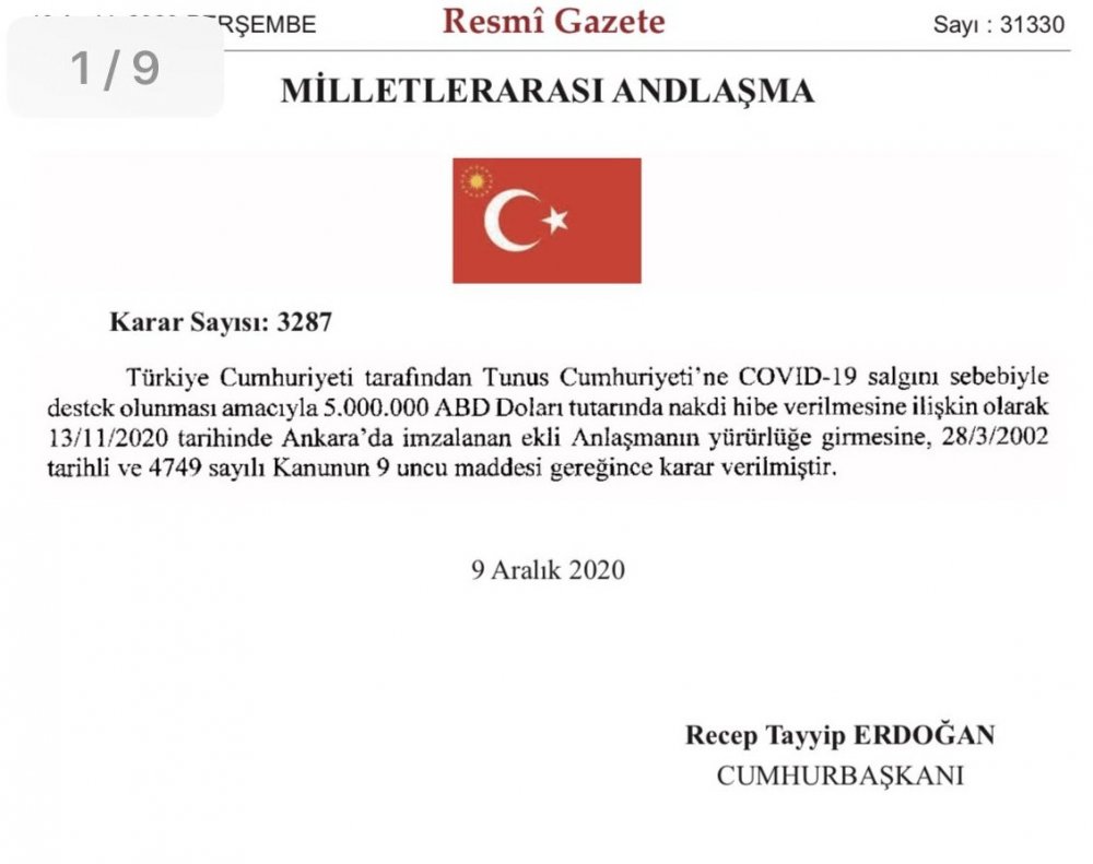 Cumhurbaşkanı Recep Tayyip Erdoğan'ın imzası ile Resmi Gazete'de önemli bir karar yayımlandı. Yayımlanan kararda Tunus'a 5 milyon dolar verileceği bildirildi.