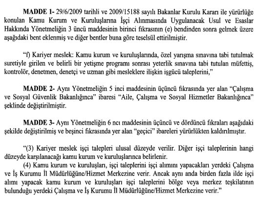 Resmi Gazete 'nin bugünkü sayısında Kamu Kurum ve Kuruluşlarına İşçi Alımında Uygulanacak Usul ve Esaslar Hakkında Yönetmelik 'te yapılan değişiklik yayımlandı. Yayımlanan değişiklik ile kamuya işçi alımında ciddi değişiklikler yapıldığı bildirildi.
