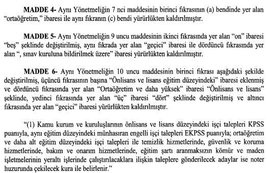 Yapılan bir diğer değişiklikte ise, kamuya işçi alımlarına KPSS puan sıralamasına göre artık alınacak sayının 4 katı kura çekimine katılacak. Önceki sistemde 3 katı kadar aday alınıyordu.
