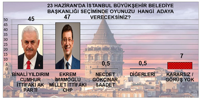 15 ile 20 Mayıs 2019 tarihleri arasında yapılan seçim anketi 11 bin kişi ile yüz yüze yapıldı. Söz konusu araştırmada İstanbullulara "Yarın seçim olsa oyunuzu hangi partiye verirsiniz?" sorusu soruldu.