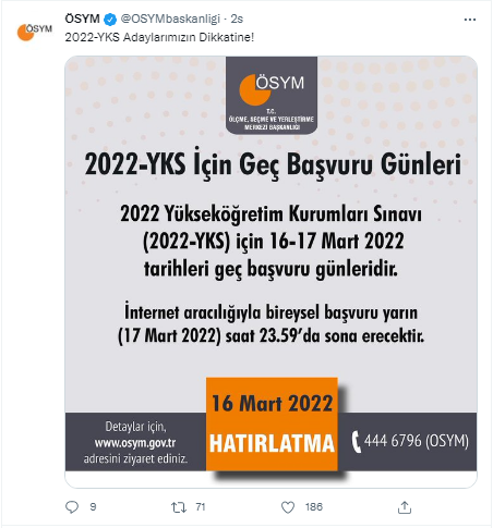 2022 Yükseköğretim Kurumları Sınavı (2022-2) için 16-17 Mart 2022 geç başvuru günleridir.