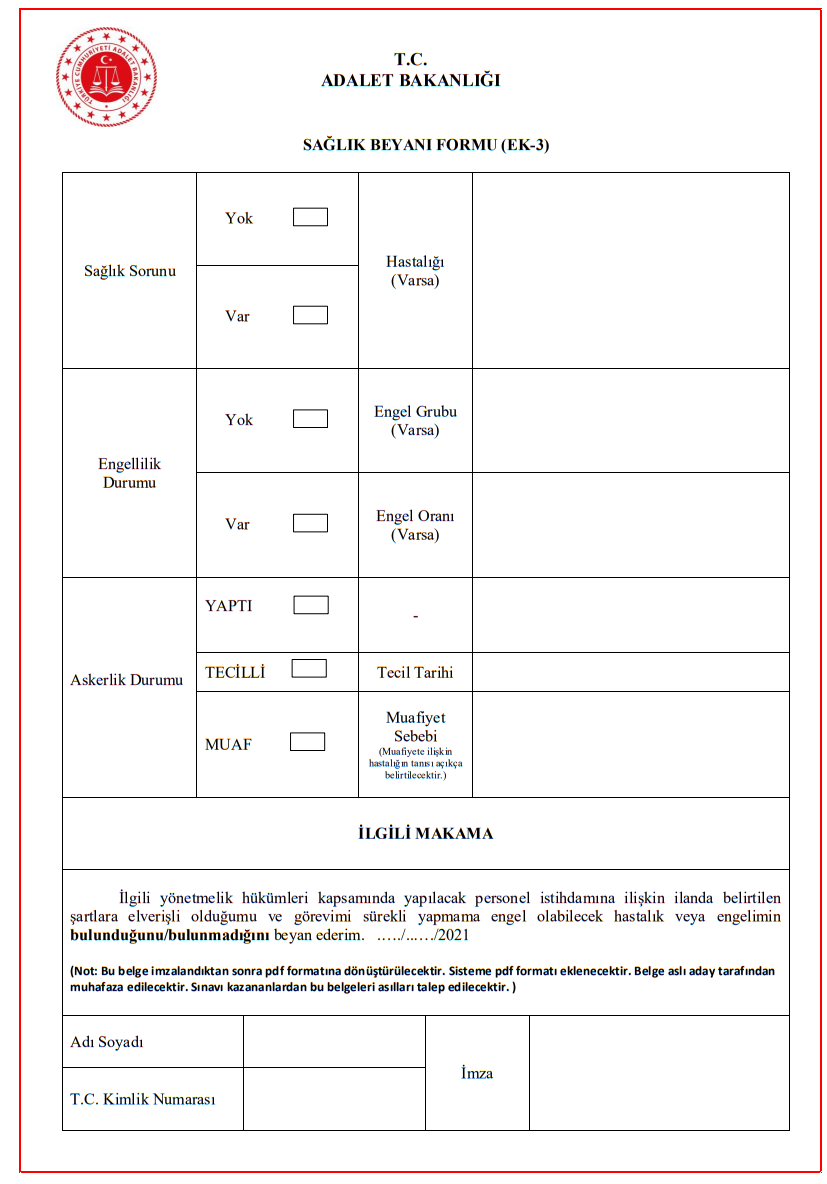 Adalet Bakanlığı 13 bin 202 personel alımı başvurusunda istenen sağlık beyanı nasıl doldurulur? Sağlık beyanı formu nedir? İşte form.