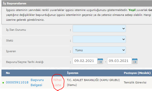 İş başvurularım kısmına tıkladıktan sonra aşağıdaki ekran karşınıza çıkacak. Burada nihai liste yazan yere tıklayın.