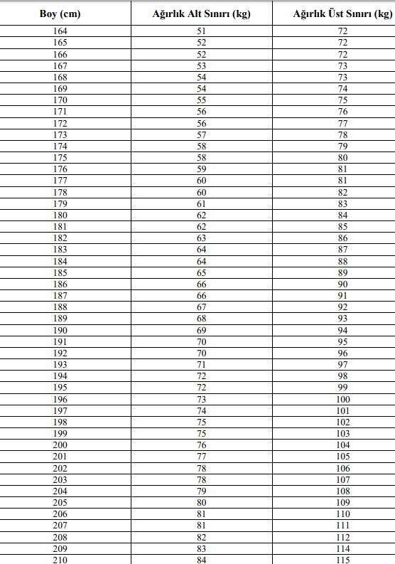 Adaylarda aranacak boy kilo şartı şu şekilde; (Not: Sözleşmeli er adaylarında ağırlık üst sınırı tablodaki üst sınırdan 10 kg fazla olabilir)