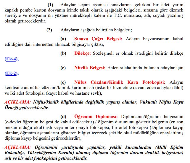 Sözleşmeli er alımında adayların yanlarında getireceği evraklar şu şekilde;