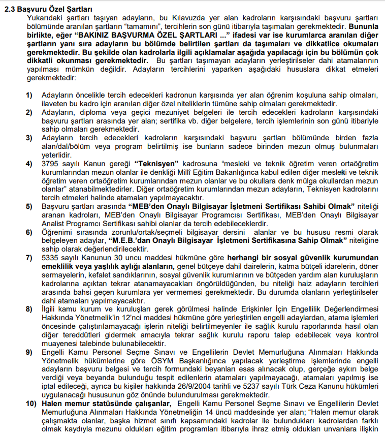 - Engelli Kamu Personel Seçme Sınavı ve Engellilerin Devlet Memurluğuna Alınmaları Hakkında Yönetmeliğin 4 üncü maddesinde; “Engelli: Doğuştan veya sonradan; bedensel, zihinsel, ruhsal, duyusal ve sosyal yetenekleri bakımından engel oranının yüzde kırk veya üzerinde ve çalışabilir durumda olduğunu mevzuat hükümlerine göre alınacak sağlık kurulu raporu ile belgeleyenleri,…ifade eder.” hükmü gereğince en az %40 ve üzerinde çalışabilir engelli olmak.
