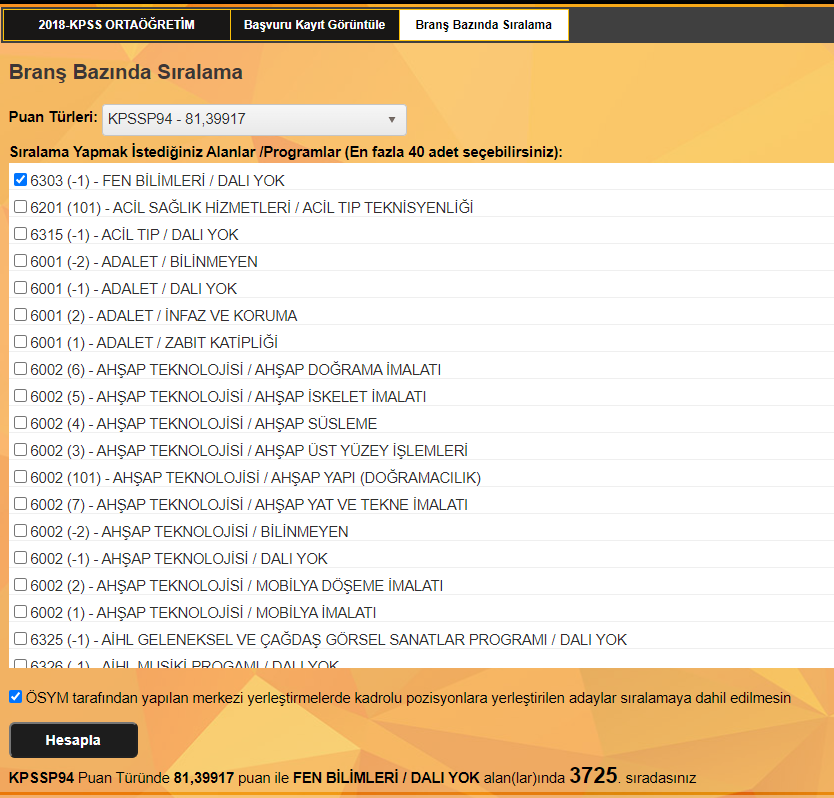 Burada mezun olduğunu bölümü seçin ve aşağıda ÖSYM tarafından... yazan yerdeki kutucuğu işaretleyip hesapla butonuna tıklayın. Branş bazında sıralamanız aşağıda yazacaktır.