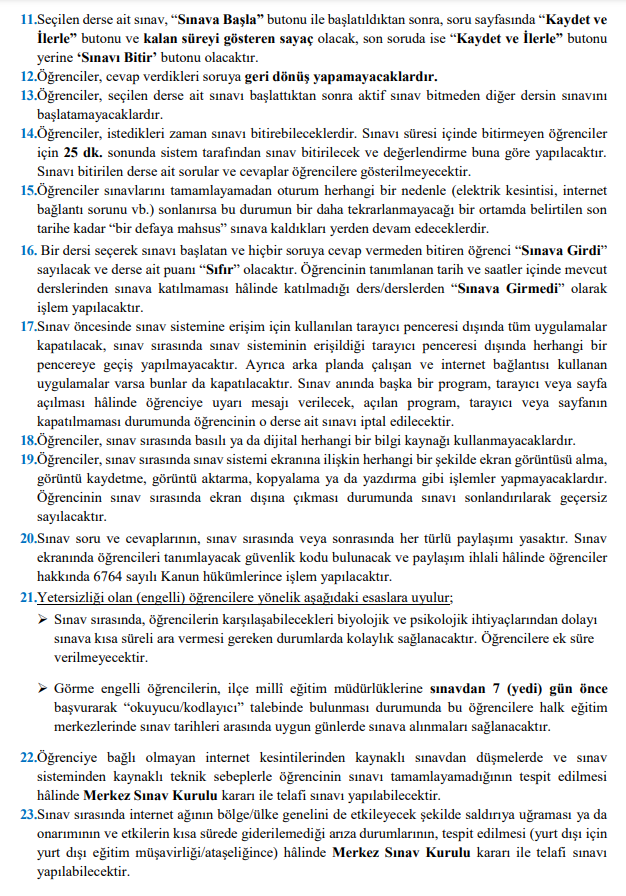 9. Öğrenciler, sınav süresi içinde kendilerine atanan en fazla 24 dersten sınava katılabilecekler ve atanan derslerden istedikleri dersi seçerek sınavı başlatıp bitirebileceklerdir.