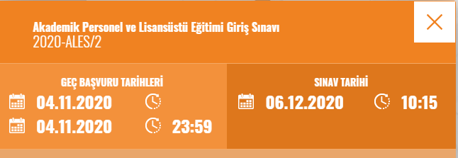 Ölçme Seçme ve Yerleştirme Merkezi tarafından yapılan açıklamada ALES/2 geç başvurularının 4 Kasım 2020 günü alınacağına yer verildi. ALES 'e başvurusunu yapmak isteyenler için geç başvuru ekranı 1 günlüğüne açık olacak ve adaylar aynı gün ücreti de yatıracak.