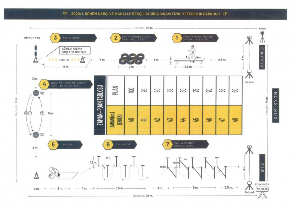 Çarşı ve Mahalle Bekçiliği aday değerlendirme ve seçme işlemlerinin bir aşaması olan fiziki yeterlilik aşamasında Çarşı ve Mahalle Bekçiliği mesleğini icra edecek adayların denge, kondisyon, çeviklik, çabukluk, kuvvet ve esneklik açısından Çarşı ve Mahalle Bekçiliği mesleğine uygunluklarını ölçecek parkur, yukarıda belirtilen ebat ve etaplardan oluşturulmuştur. Çarşı ve Mahalle Bekçiliği Giriş Sınavı fiziki yeterlilik parkuru ve zaman/puan cetveli oluşturulmuş ve ekte sunulan şablonda belirtilmiştir.