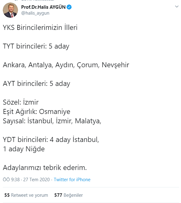 Ölçme Seçme ve Yerleştirme Merkezi Başkanlığı tarafındna bir duyuru yayımlandı. ÖSYM resmi internet adresi üzerinden yayımlanan duyuruda 2020 YKS 'ye giren ve oturumlarda birinci olan gençlerin hangi şehirden olduğuna yer verildi.