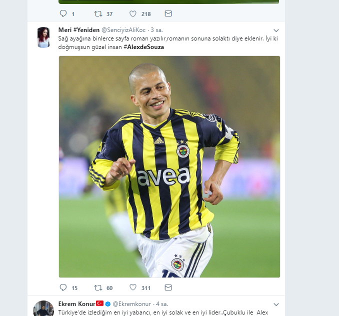 Alex De Souza'nın doğum gününü kutlamak isteyen binlerce taraftar twitter , facebook sitelerden Fenerbahçe'nin efsane kaptanı Alex De Souza paylaşımları yapıyor. 41 yaşına giren Alex, zamanın teknik direktörü Aykut Kocaman ile ters düşmüş, kısa süre sonra da takımdan tepki çeken bir şekilde gönderilmişti. Kariyerini memleketinde sonlandıran Alex, ara ara sosyal medya sitesinden Türkçe mesajlar atıyor, Fenerbahçeli taraftarlarla bir araya gelerek hasret gideriyor.