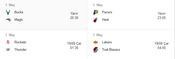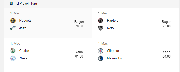 Basketbol'un en üst seviyesi olarak kabul edilen NBA'de koronavirüs gölgesi altında geçen Orlando Kampüsü maçlarının ardından Play-Off heyecanı başlıyor. bu akşam TSİ saat 20.30'da Nuggets - Utah Jazz ile karşı karşıya gelecek. Gecenin diğer karşılaşmaları ise Raptorz- Nets (TSİ 23.00) , Celtics - 76ers (01.30) , Clippers - Mavericks (TSİ 04.00) olacak.