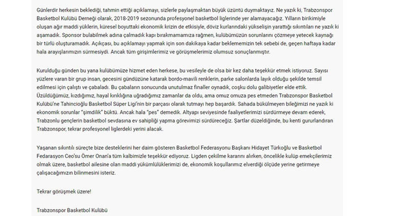 Trabzonspor Basketbol Kulübü, ekonomik gerekçeleri öne sürerek Basketbol Süper Ligi'nden çekildiğini açıkladı. Bir süredir oyuncu sıkıntısı yaşayan, ekonomik sorunları ile gündeme gelen Trabzonspor Basketbol Süper Ligi'nden resmen çekildiğini açıkladı. Kulüp tekrar faaliyetlerine başlaması halinde Bölgesel Lig'den yoluna devam etmek durumunda kalacak. Geçtiğimiz sezon oldukça zorlanarak kümede kalan Trabzonspor, A takım seviyesinde oyuncu sıkıntısı yaşıyor, personel maaşlarını 6 aydır ödeyemiyordu. Sponsorların da çekilmesi, FİBA'daki 12 ayrı dosyadan borç ve transfer yasağının bulunması Trabzonspor'u ligden çekilmeye iten sebepler arasında yer alıyor. Hürriyet gazetesinden Fatih Saboviç, geçtiğimiz ay Trabzonspor'un basketbol şubesini kapatmaya hazırlandığını yazmıştı.