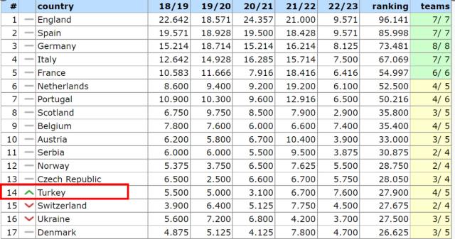 2024-2025 sezonunda Avrupa kupalarında 5 takımla katılmak için ilk 15E girmemiz gerek tabloda, dün akşamki galibiyetler sonrası 4 basamak birden yükselerek 14’üncü sıraya yükseldik.
