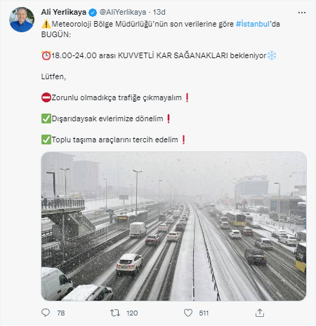 Beklenen kar yağışının akşam 18.00-24.00 saatlerinde kuvvetli olacağını duyuran Vali Yerlikaya, vatandaşların zorunlu olmadıkça evden dışarı çıkmaması ve trafiğe çıkmaması uyarılarında bulundu, ayrıca toplu taşımanın kullanılmasını istedi.