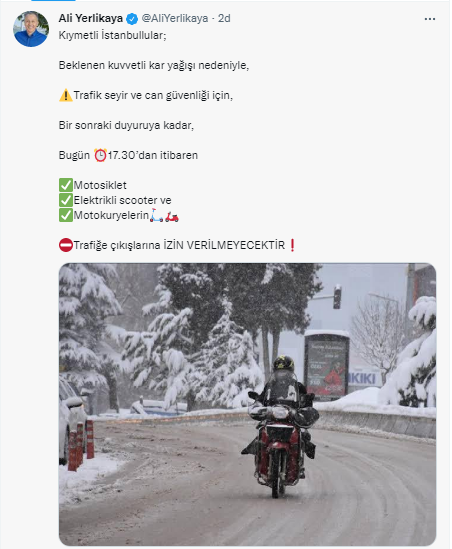 Vali Yerlikaya son paylaşımında bugün saat 17.00’den itibaren motosiklet, elektrikli scooter ve motokuryelerin bir sonraki duyuruya kadar trafiğe çıkmasına izin verilmeyeceğini duyurdu.