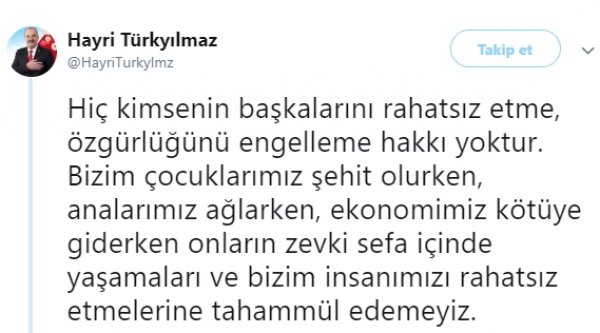 Belediye Başkanı Twitter 'dan da konu ile ilgili açıklama yaptı ve söz konusu haberleri Twitter adresinden paylaşarak; "Hiç kimsenin başkalarını rahatsız etme, özgürlüğünü engelleme hakkı yoktur. Bizim çocuklarımız şehit olurken, analarımız ağlarken, ekonomimiz kötüye giderken onların zevki sefa içinde yaşamaları ve bizim insanımızı rahatsız etmelerine tahammül edemeyiz." dedi.