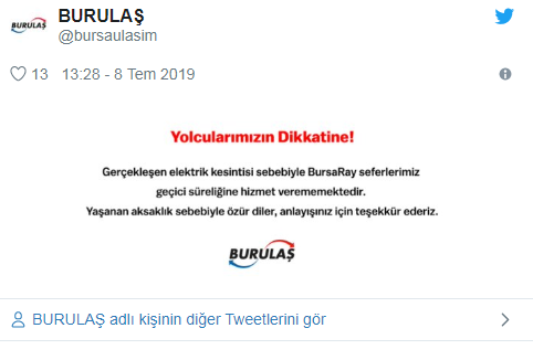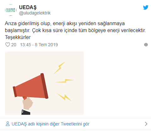 “08 Temmuz 2019 Pazartesi saat 12.45 civarında ilimiz genelinde yaşanan elektrik kesintisi; TEİAŞ’a ait Büyük Trafo Merkezinde meydana gelen büyük mekanik arıza nedeniyle gerçekleşmiş olup, ekiplerin arızaya müdahalesinin ardından kopan iletkenin kaldırılabilmesi için çalışmalara başlanılmış ve arızadan izole edilen bölgelere enerji verilmeye başlanılmış olup, 2 saat içinde de il genelinde elektrik verilmeye başlanılacaktır. Kamuoyuna saygıyla duyurulur.”