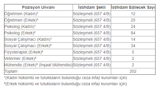 Ceza ve Tevkifevleri Genel Müdürlüğü'ne 202 sözleşmeli personel alımı için başvuru süreci devam ediyor. CTE'den yapılan resmi duyuruda, Öğretmen, psikolog, sosyal çalışmacı, fizyoterapist, veteriner ve mühendis unvanlarında personel alınacağı belirtilmiş, kadın-erkek kontenjan dağılımının yanı sıra ilgili ilana başvuru yapacak adaylarda aranacak genel ve özel şartlarda resmi duyuruda yer almıştı. CTE Personel alımıyla ilgili tüm detaylar bu haberimizde...