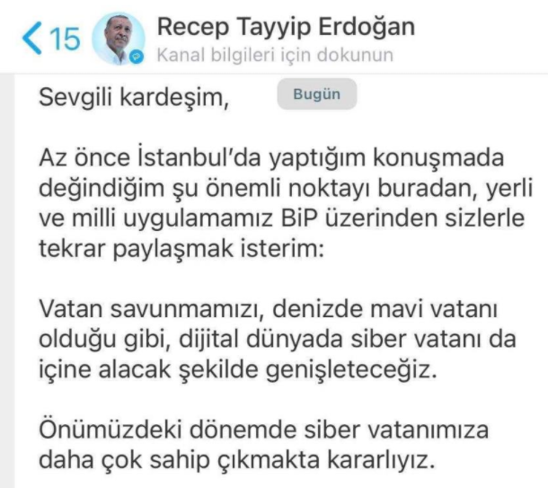 Erdoğan, sosyal medya hesabından yaptığı paylaşımda, İstanbul'da yaptığı konuşmayı hatırlatarak, "Az önce İstanbul'da yaptığım konuşmada değindiğim şu önemli noktayı buradan, yerli ve milli uygulamamız olan BİP üzerinden sizler ile paylaşmak isterim: Vatan savunmamızı, denizde mavi vatanı olduğu gibi dijital dünyada siber vatanı da içine alacak şekilde genişleteceğiz. Önümüzdeki dönemde siber vatanımıza daha çok sahip çıkmakta kararlıyız. Sizleri sevgiyle, muhabbetle selamlıyorum." ifadelerini kullandı.