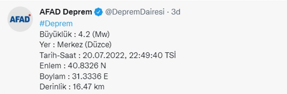 Akşam saatlerinde merkez üssü Düzce olan 4.2 şiddetinde bir deprem meydana geldi. Yerin 16,47 km derinliğinde gerçekleşen deprem paniğe sebep oldu.