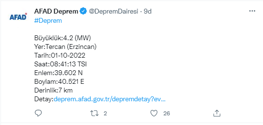 Son Dakika. Erzincan’da deprem meydana geldi. AFAD, depremin şiddetini 4.2 olarak duyurdu.