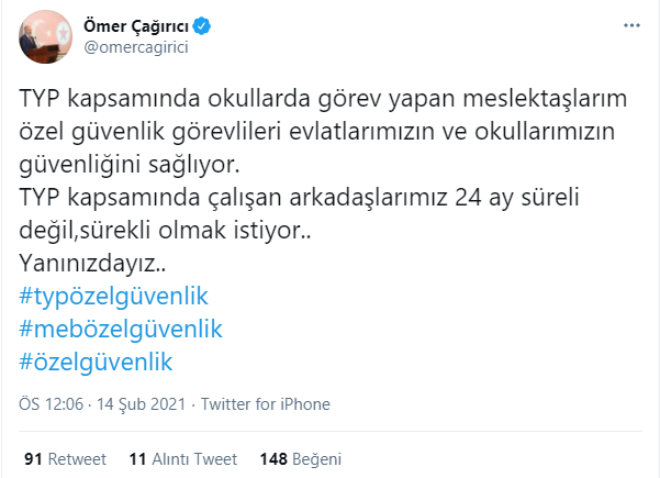 Güvenlik İş Sendikası Genel Başkanı Ömer Çağırıcı, sosyal medya hesabından yayımladığı mesajda, güvenlik görevlilerinin yanlarında olduklarını vurgulayarak, "TYP kapsamında okullarda görev yapan meslektaşlarım özel güvenlik görevlileri evlatlarımızın ve okullarımızın güvenliğini sağlıyor. TYP kapsamında çalışan arkadaşlarımız 24 ay süreli değil,sürekli olmak istiyor.. Yanınızdayız.. #typözelgüvenlik #mebözelgüvenlik #özelgüvenlik" ifadelerini kullandı.
