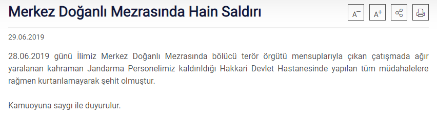 "Çatışmada ağır yaralanan kahraman jandarma personelimiz kaldırıldığı Hakkari Devlet Hastanesinde yapılan tüm müdahalelere rağmen kurtarılamayarak şehit olmuştur."