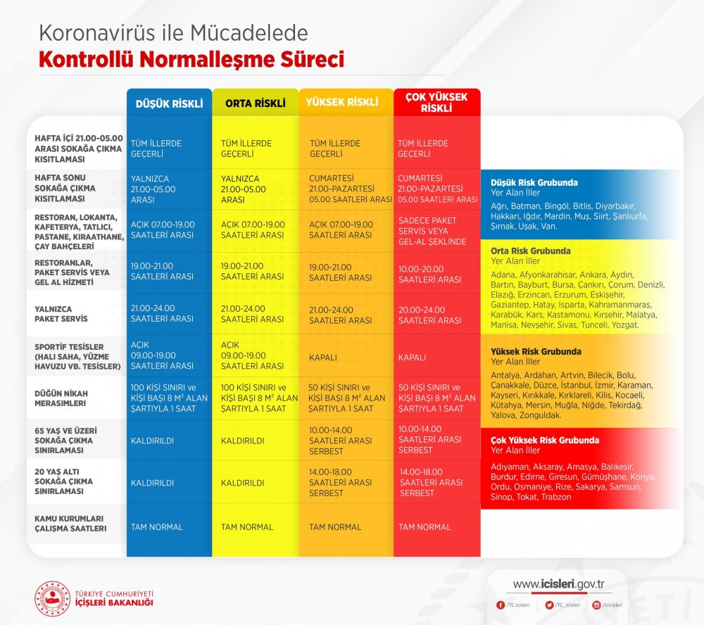 1. Sağlık Bakanlığı ve Koronavirüs Bilim Kurulu tarafından tespit edilen kriterlere göre iller 4 ayrı risk grubuna (düşük, orta, yüksek, çok yüksek) ayrılarak salgınla mücadeledeki tedbir seviyeleri risk gruplarına göre belirlenecektir.