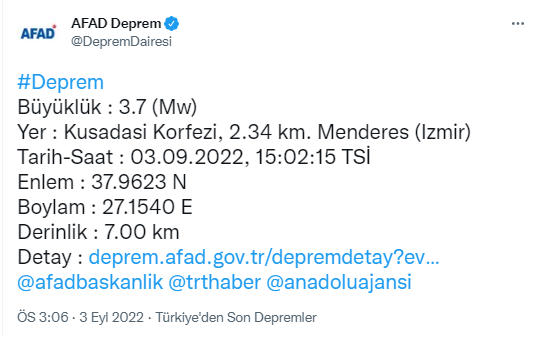 Buna göre merkez üssü Menderes olan 3.7 şiddetinde bir deprem meydana geldi. deprem saat 15.02’de yaşandı. Deprem ile ilgili henüz bir olumsuzluk yaşanmazken vatandaşlar kendini korku içinde dışarı attı.